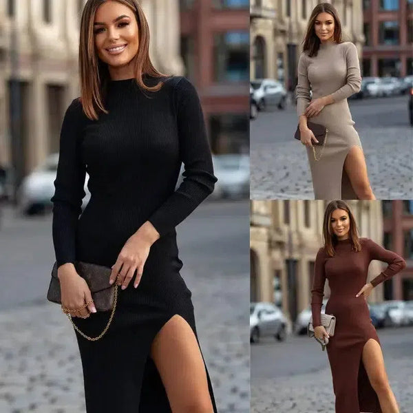 Autumn And Winter Dresses Round Neck Slim Solid Color