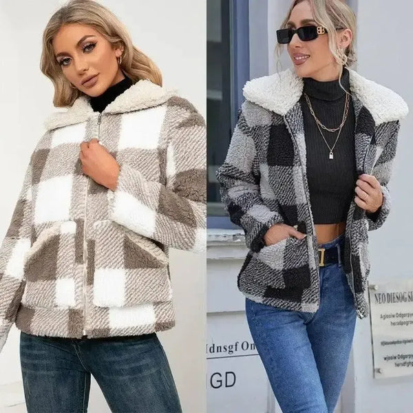 Casual Check Plush Lapel Jacket Lamb Fleece Check Pocket Top