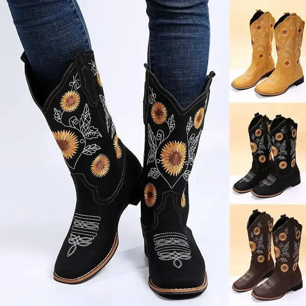 Cowboy Boots Women Sunflower Embroidery Shoes Low Heel