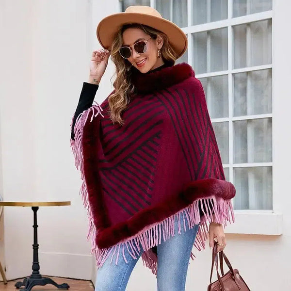 Drizzling Fur Collar Pullover Tassel Knitted Cape For Women