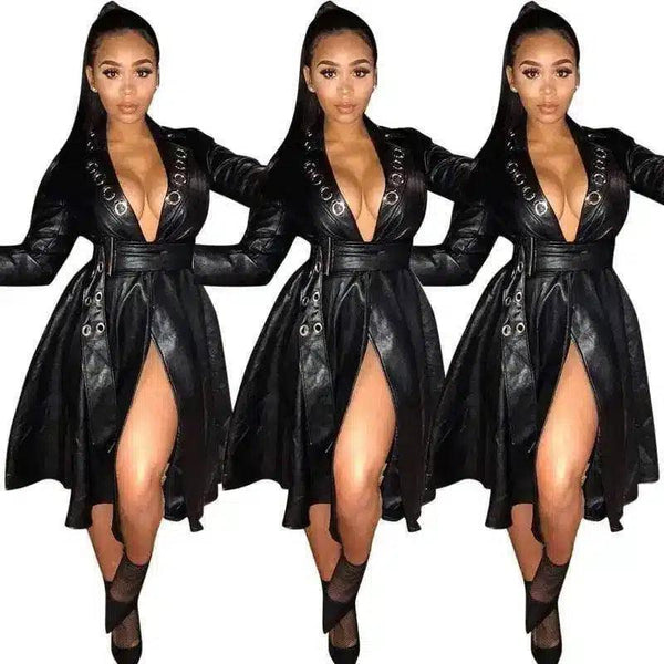 - Additional details: Features a high-slit, double-breasted button accents, and a belted waist