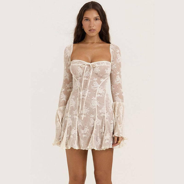 Lace Square Collar Dress Bell-bottom Long Sleeve Tied A- Line Dresses Womens Clothing