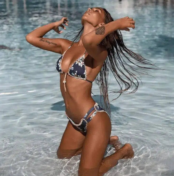 dark blue hand-knitted Shell with Split-body print swimsuit