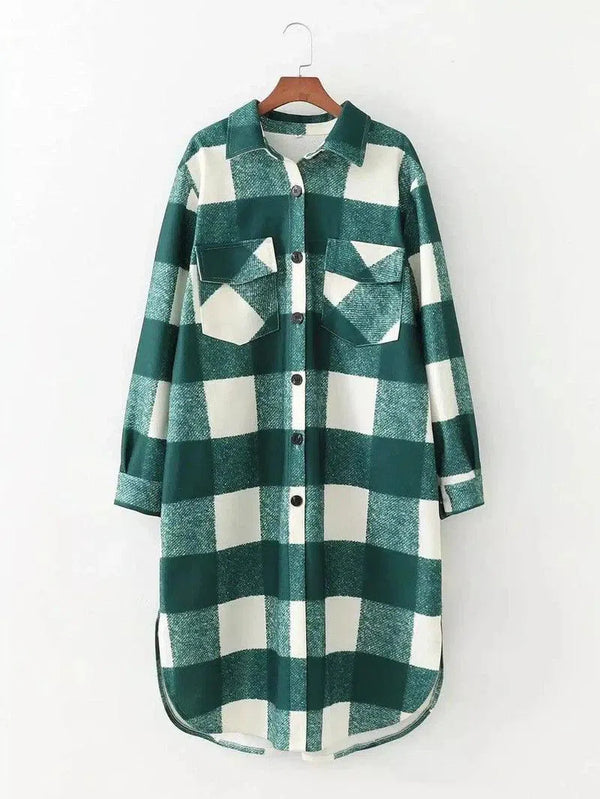 - Design Details: Bold Green and White Checkered Pattern, Two Chest Pockets with Flaps, Button-Down Front Closure