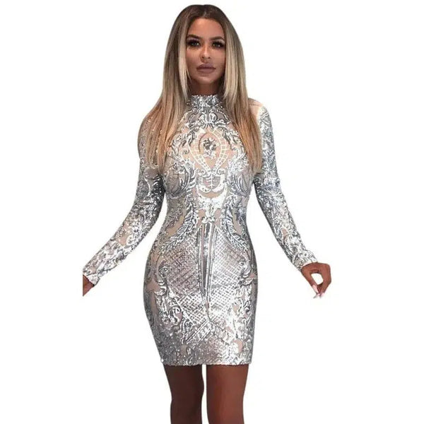High Neck Long Sleeve Sequin Elegant Party Dress