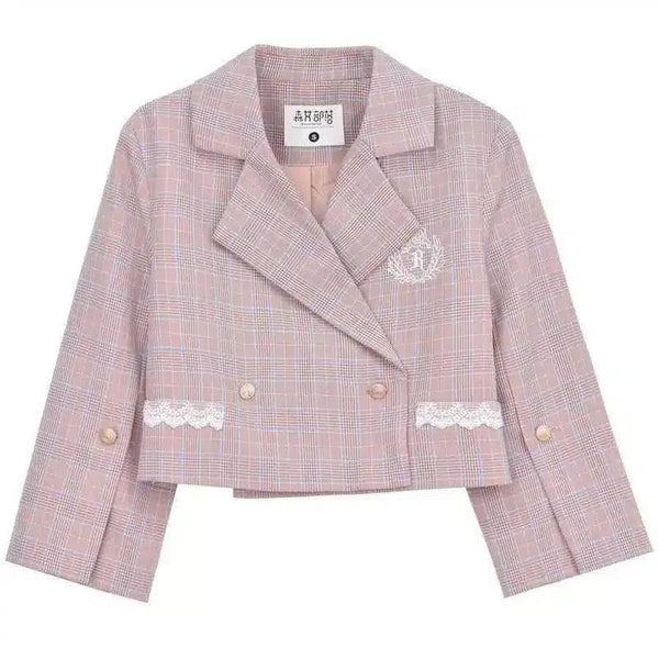 - Design Details: Double-Breasted Closure, Lace Trim Detailing on Pockets, Checkered Pattern
