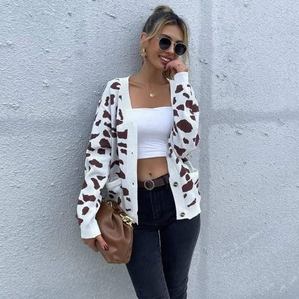Leopard Print V-Neck Knitted Sweater Coat