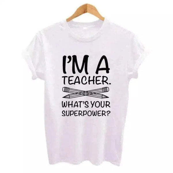 - Design Features: Front side features bold typographic print with the phrase "I'M A TEACHER. WHAT'S YOUR SUPERPOWER?" accompanied by a graphic of two crossed pencils below the text.