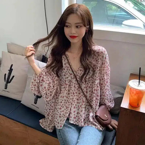 Floral V-Neck Women's Casual Blouse