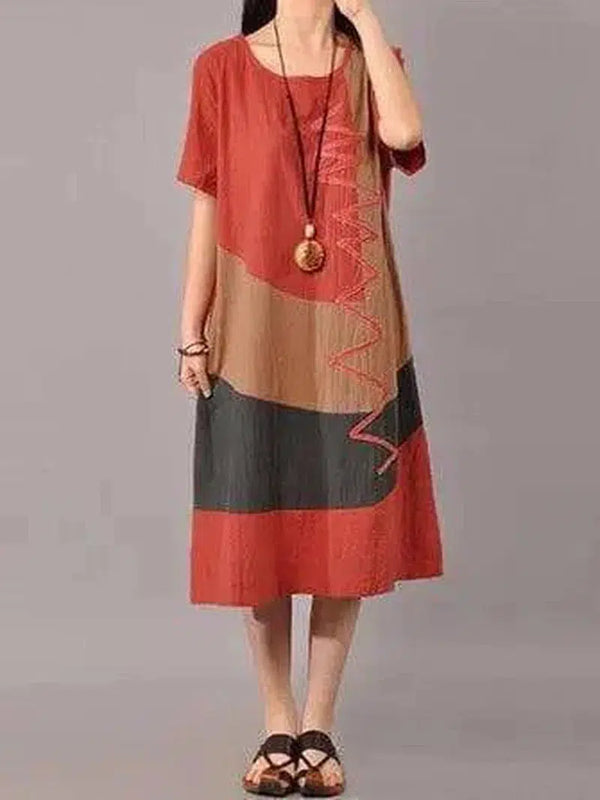 S-5XL Women Casual Short Sleeve Splice Loose O-neck Mid Long