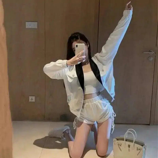 - Fit or stretch: Drawstring-adjustable waist on shorts; loose-fitting jacket