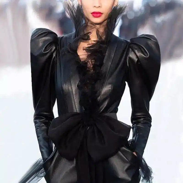 - Additional details: Puffed shoulders, large bow at the waist, sheer elements at the neckline and cuffs