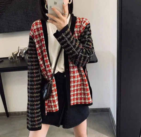 - Intricate Pattern Design: The blazer features a classic houndstooth pattern in red and black, interspersed with subtle metallic threads for a hint of shimmer and glam.