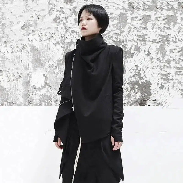 Turtleneck Long Sleeve Black Zip Irregular Coat