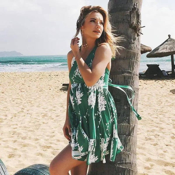 V-neck Halter Print Sleeveless Beach Dress