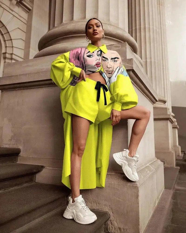 - Additional Details: Front graphic design, split hem extending into a high-low silhouette