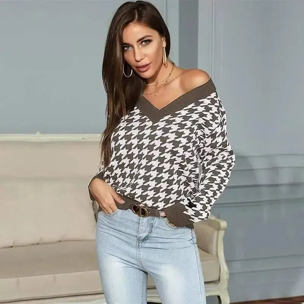 Women Long-Sleeved Houndstooth Jacquard V-Neck Base Knitted