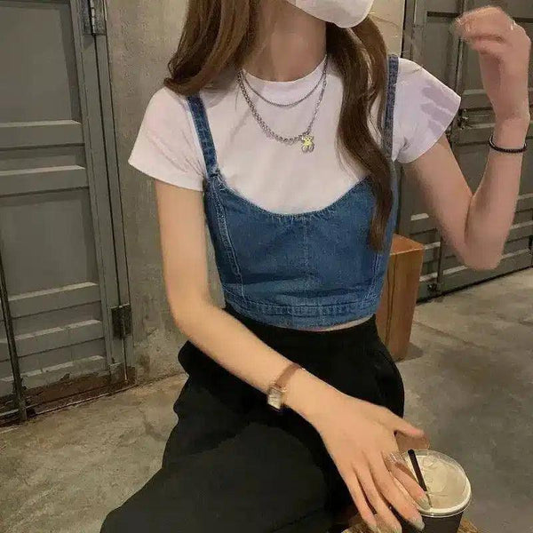 - Type of garment: Layered ensemble featuring a denim crop top over a basic white t-shirt