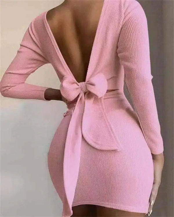- Neckline: Deep V-back with a bow detail