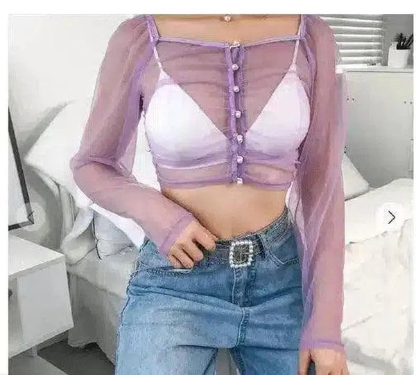 Women's Sheer Button-Up Crop Top with Long Sleeves