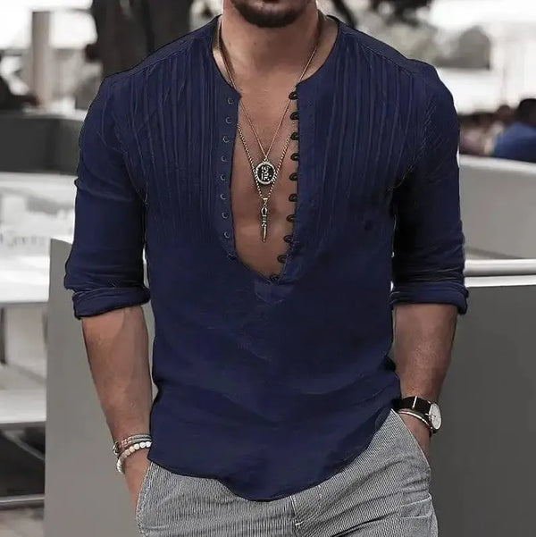 Men's Casual Loose Button Cotton Round Neck Shirt