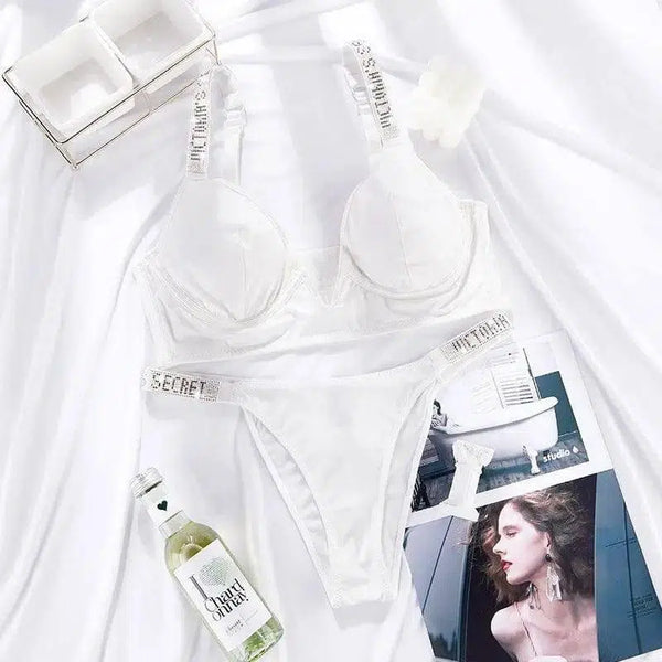 Push Up Deep V Letter Rhinestones Bra Set Women