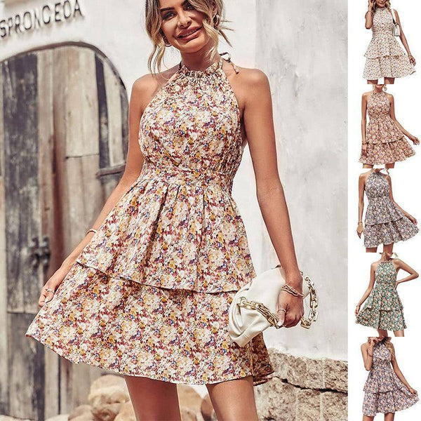 Summer Printed Halter Dress Fashion Boho Backless Ruffled