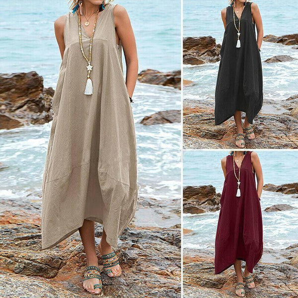 Women's Cotton And Linen V-neck Pocket Casual Dress