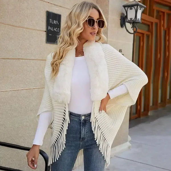 Product Description: Women's Fur Collar Tassel Shawl Knitted