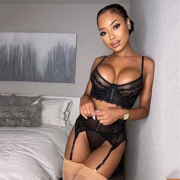 Women's Lace Eyelash Stitching Sling Lingerie Three-piece