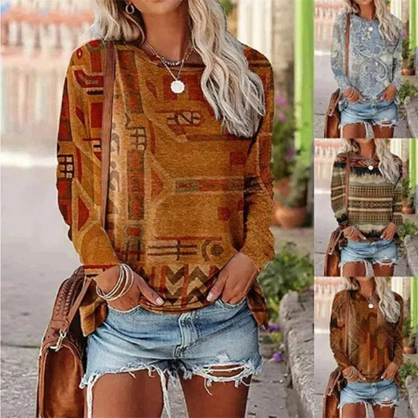 Women's Printed Long-sleeved Pullover Round Neck Top
