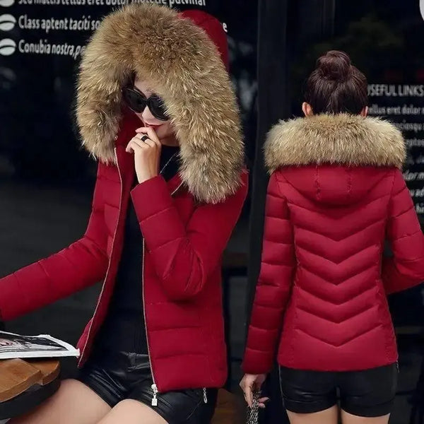 - Neckline/Shoulder Style: High collar with a fur-trimmed hood